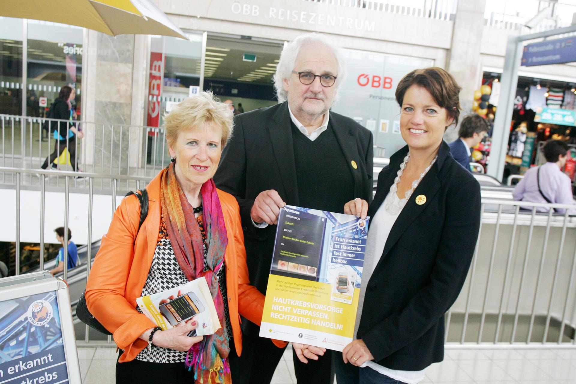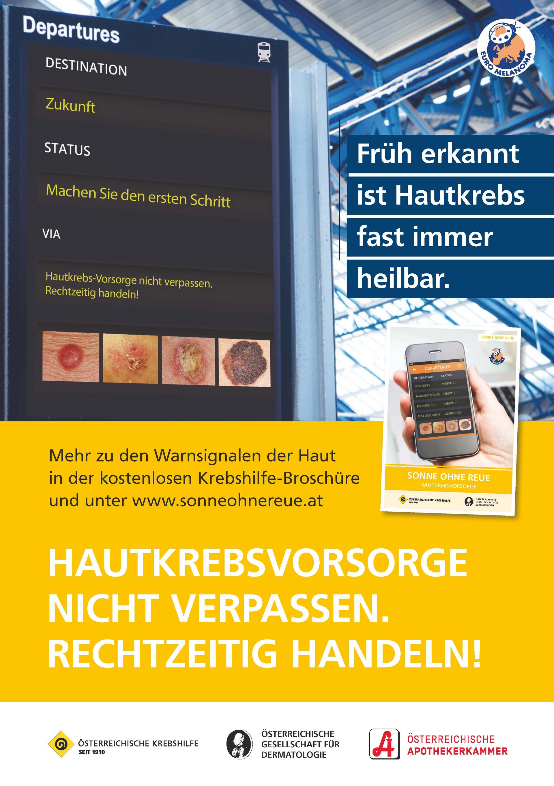 Am European Melanona Day wird europaweit öffentlichkeitswirksam unter dem Motto "DELAYED" auf die Gefahr von zu spät erkanntem Hautkrebs hingewiesen. "Hautkrebs ist heilbar, wenn er frühzeitig erkannt und operativ entfernt wird. Das Wichtigste ist daher die frühzeitige Diagnose. Das gilt sowohl für den schwarzen als auch den weißen Hautkrebs", erklärt Prof.Pehamberger weiter. In der Bahnhofcity Wien West, am Hauptbahnhof Klagenfurt, an einer eigens eingerichteten "Gesundheits-Haltestelle" im Grazer Murpark und am Tag der offenen Tür an der Hautklinik Innsbruck erhalten Interessierte an diesem Tag neben ausführlichen Informationen zur Hautkrebsvorsorge auch eine kostenlose hautärztliche Beratung.