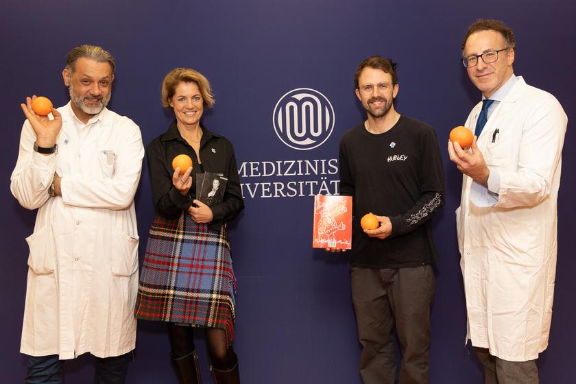 Unter dem Motto: „Bewusstsein schaffen und Angst nehmen“ lud die Österreichische Krebshilfe heute zur ungewöhnlichen OP-Challenge mit Felix Schellhorn vom Kochkollektiv der Healthy Boy Band ins Wiener AKH: Die mit präzisen Schnitten von Profi-Koch Felix Schellhorn filetierte Orange wurde von Univ.-Prof. Dr. Harun Fajkovic, MSc. F.E.B.U mit Hilfe des modernen roboter-assistierten Operationssystems da Vinci wieder zusammengesetzt. Damit wurde eindrucksvoll gezeigt, mit welcher Präzision Operateur:innen unter Einsatz von Hightech-Medizin heute arbeiten. „Genau diese Präzision schafft einen möglichst schonenden, sogenannten minimalinvasivenk, Eingriff. Dass wir das heute mit einem ungewöhnlichen Kollegen zeigen können, freut mich besonders!“, freut sich Univ.-Prof. Dr. Fajkovic über diese Aktion.