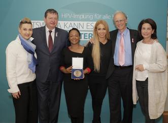 v.l.n.r.: Dr. Mathias Tischer (Österr. Ges. für Urologie und Andrologie), Dr. Sabine Badelt (ÖÄK, Impfreferentin, SchulärztInnen), Univ. Prof. Dr. Christian Singer (Präsident Gesellschaft Senologie), Prof. Dr. Dietmar Thurnher (Präsident der Gesellschaft der HNO-ÄrztInnen), Univ. Prof. Dr. Thomas Szekeres (Präsident der Österr. Ärztekammer), Dr. Herwig Lindner (Ärztekammer Stmk.), OA Dr. Christian Schauer (AGO-Präsident), Dr. Gunda Pristauz-Telsnigg (Präsidentin der Gesellschaft der GynäkologInnen), Prof. Dr. Doreen Ramogola-Masire (Ehrengast aus Botswana, Preisträgerin), Univ.-Prof. Dr. Paul Sevelda (Krebshilfe-Präsident), Univ. Prof. Dr. Elmar Joura (HPV-Impfexperte, MedUni Wien), Peter Lehner (Obmann des DV der österr. Sozialversicherungen), Mag. Dr. Ulrike Mursch-Edlmayr (Präsidentin Österr. Apothekerkammer), Doz. Dr. Hans Jürgen Dornbusch (Impfreferatsleiter Österr. Ges. der KinderärztInnen)