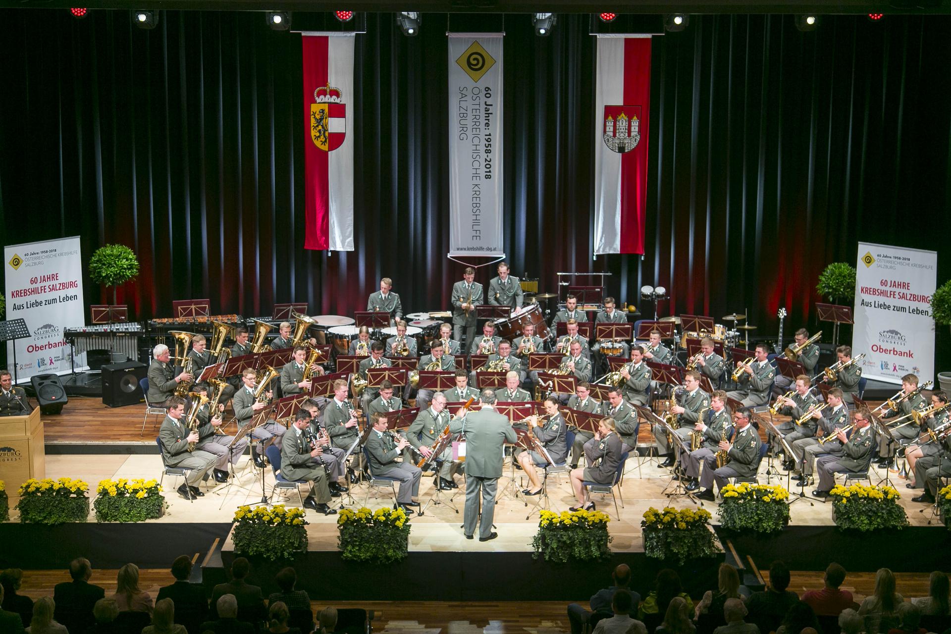 Mit einem großen Benefizkonzert der Militärmusik Salzburg feierte die Krebshilfe Salzburg gestern ihr 60-jähriges Bestehen. Im voll besetzten Kongresshaus in Salzburg wurde den über 1200 Besuchern und Ehrengästen ein schwungvoller Abend für das Leben geboten. Militärmusikkapellmeister Oberst Herzog hat für diesen Abend mit seiner Militärmusik Salzburg und den rund 60 Musikern ein besonderes Programm für die Krebshilfe zusammengestellt. Mit langanhaltendem Applaus und nach zahlreichen Zugaben, ging der gelungene und umjubelte Jubiläumsabend der Krebshilfe mit dem traditionellen Rainermarsch zu Ende.