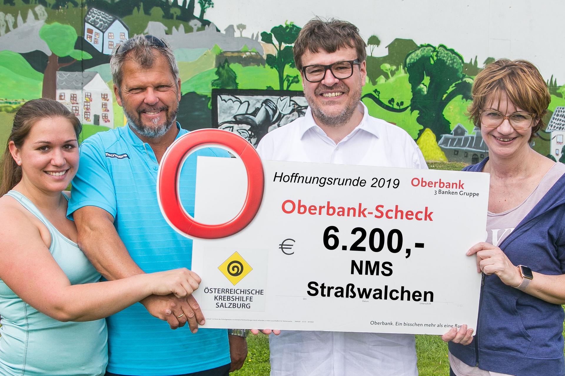 Am 6. Juni 2019 wurde in Straßwalchen richtig geschwitzt! Schülerinnen und Schüler der NMS Straßwalchen liefen für den GUTEN ZWECK. Unter dem Motto "laufend Gutes tun" sind beim Krebshilfe Charitylauf "Die Hoffnungsrunde" unzählige Runden gelaufen worden. Die Schülerinnen und Schüler umrundeten dabei das gesamte Schulgelände. "Heute hier zu sein und am Ende des Vormittags einen solchen Scheck in Empfang nehmen zu dürfen, ist mir eine besondere Freude. Erst die vielen freudigen Gesichter beim Lauf und danach dann das große Gruppenbild mit wirklich sehr engagierten jungen Menschen, da nehmen wir wieder viel Lebensfreude und Energie für unsere Arbeit für an Krebs erkrankte Menschen mit. Ich möchte allen von ganzem Herzen danken, die diesen Lauf in Straßwalchen ermöglicht haben. Mein besonderer Dank geht an Barbara Gimmelsberger, Theresa Höller und Bernhard Oberascher! Mein allergrößter Dank geht aber an die Kinder und Jugendlichen, die durch ihr Mitwirken und durch das Sammeln von vielen Spenden so tatkräftig am Ergebnis des Laufs mitgewirkt haben! Ihr seid Spitze!" freut sich Krebshilfe Geschäftsführer Mag. Stephan Spiegel bei der Scheckübergabe.