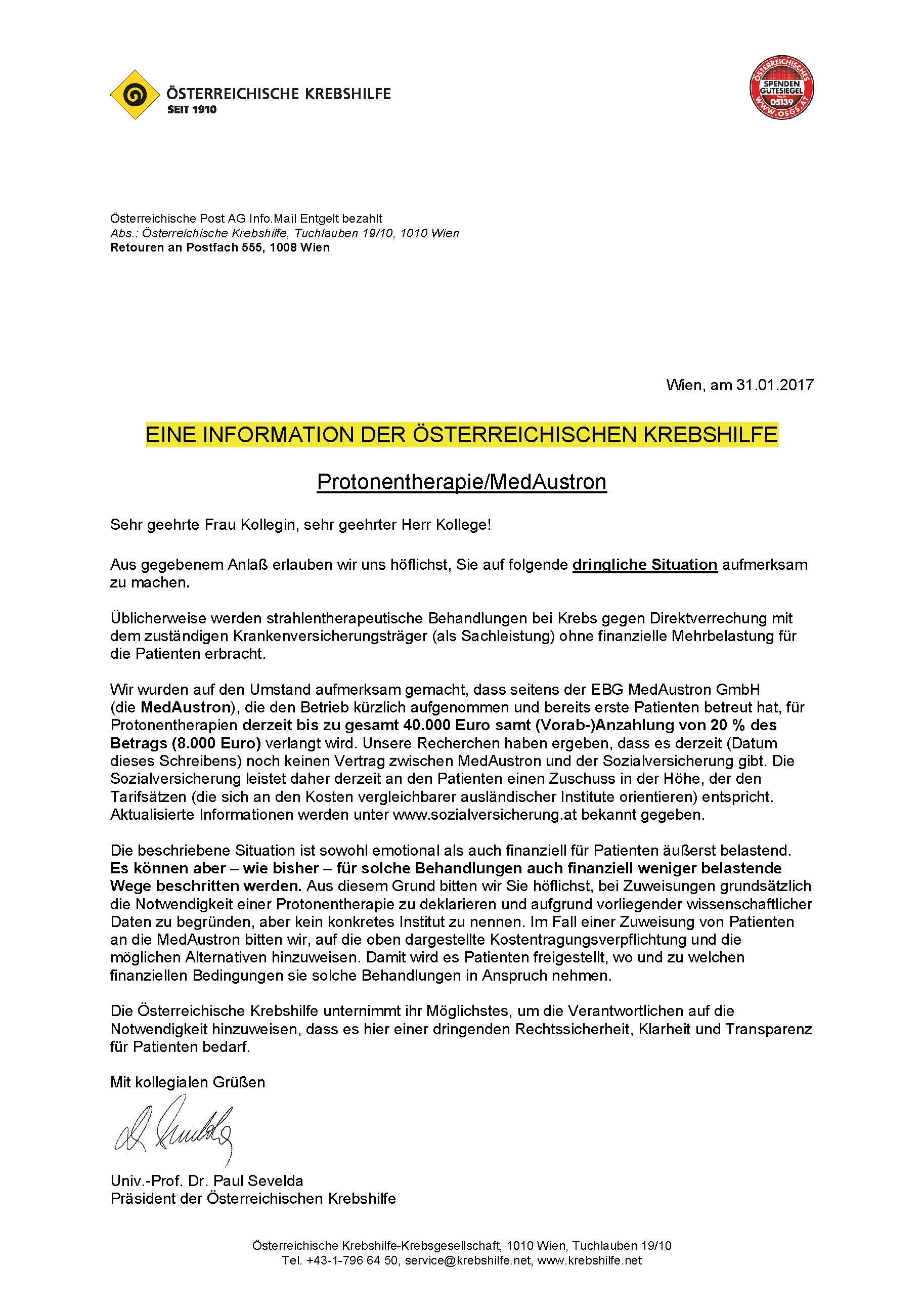 Wir wurden auf den Umstand aufmerksam gemacht, dass seitens der EBG MedAustron GmbH (die MedAustron), die den Betrieb kürzlich aufgenommen und bereits erste Patienten betreut hat, für Protonentherapien derzeit bis zu gesamt 40.000 Euro samt (Vorab-)Anzahlung von 20 % des Betrags (8.000 Euro) verlangt wird. Unsere Recherchen haben ergeben, dass es derzeit (Datum dieses Schreibens) noch keinen Vertrag zwischen MedAustron und der Sozialversicherung gibt. Die Sozialversicherung leistet daher derzeit an den Patienten einen Zuschuss in der Höhe, der den Tarifsätzen (die sich an den Kosten vergleichbarer ausländischer Institute orientieren) entspricht. Aktualisierte Informationen werden unter www.sozialversicherung.at bekannt gegeben.